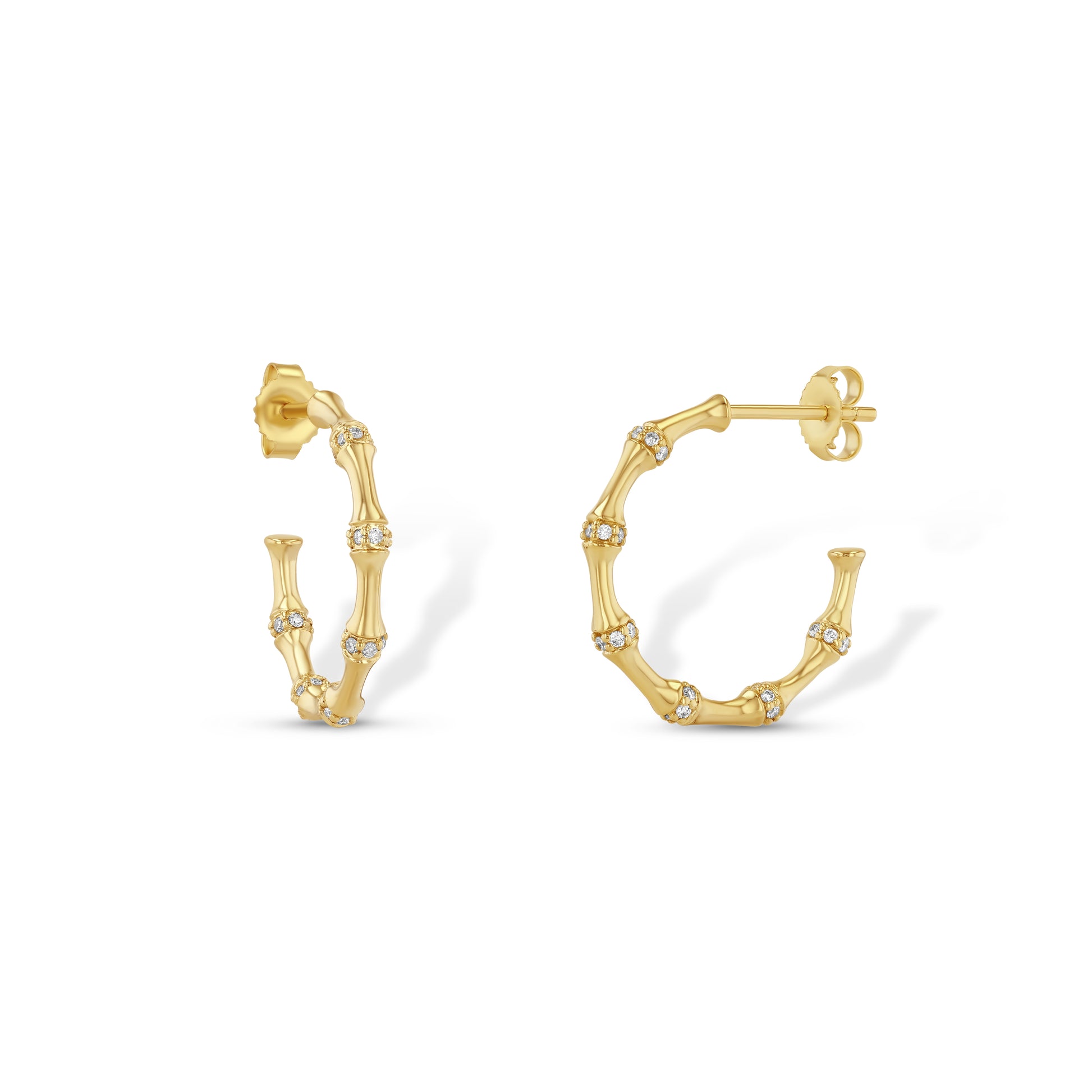 14k yellow gold hoops made up of staggered bamboo and diamond segments. Embellished with 72 diamonds @ 0.288 cts. Earrings are 20mm in diameter and affixed with posts. Very wearable pair of hoops - great for both everyday and into evening. These earrings pair beautifully with our Bamboo Diamond T-Bar Necklace and Bamboo Diamond Ring.
