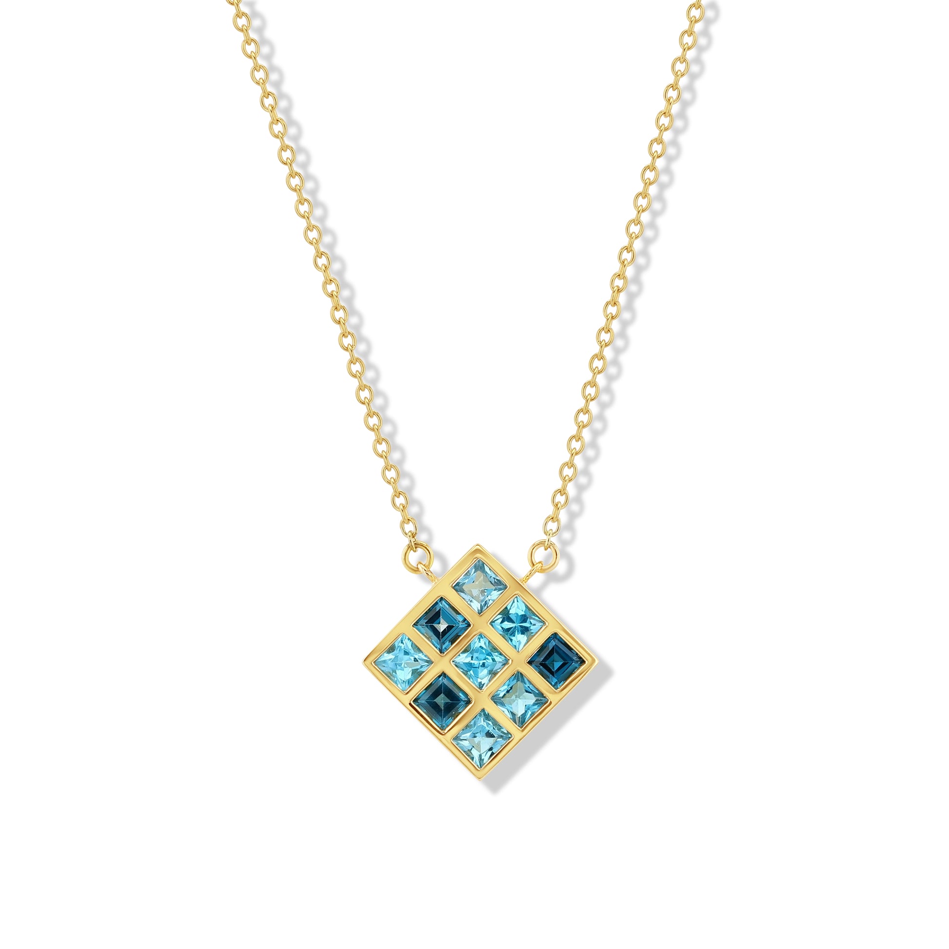 Whimsical and eye-catching, this substantial, square-shaped necklace is composed of 1.5 ctw Swiss and London Blue, princess-cut squares. The squares are set in 14k yellow gold and suspended from a cable chain, adjustable from 16 to 18 inches. Fantastic alone, or with the matching Pink Blue Topaz Squares Necklace to make it a set.