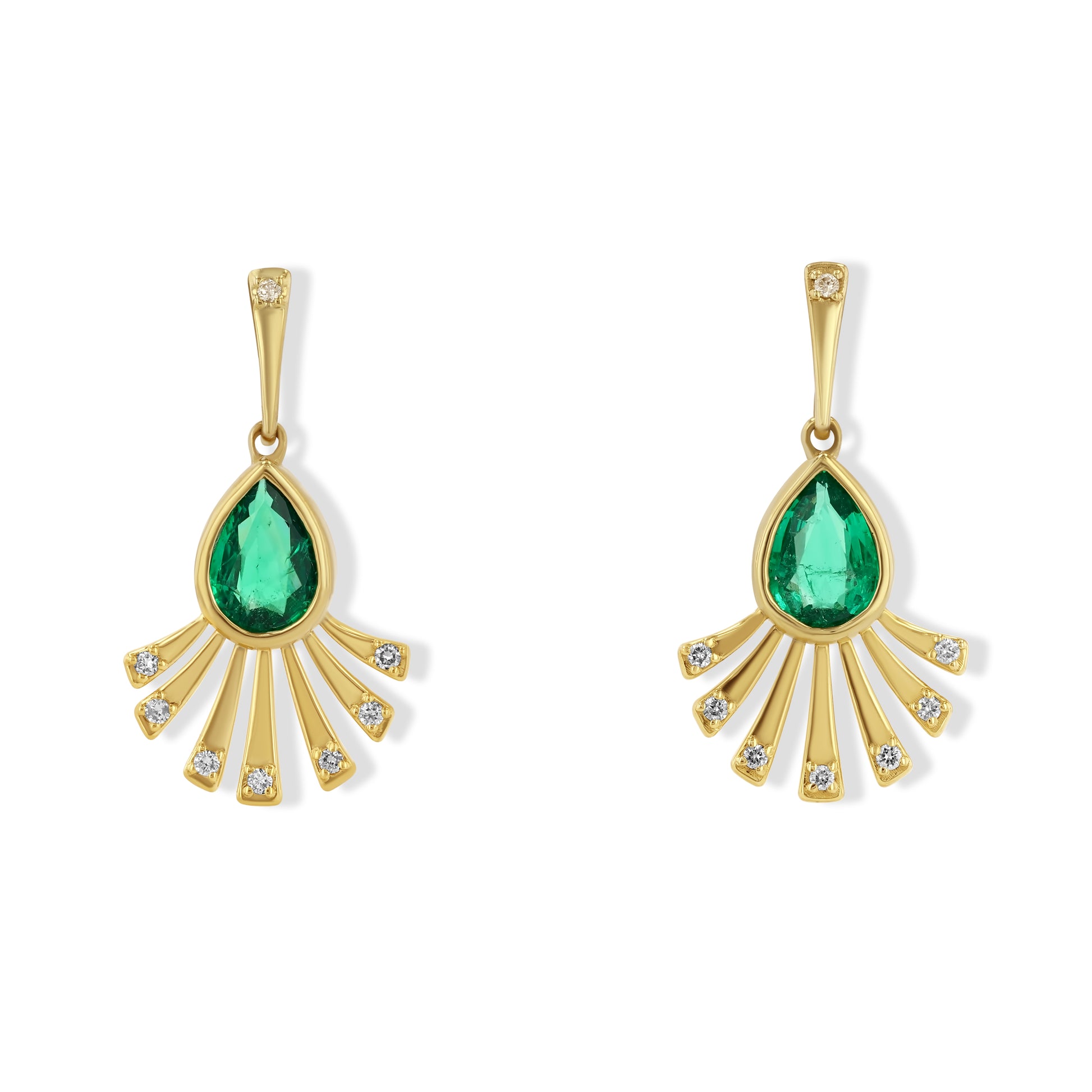 These unique, statement drop earrings feature 2 pear shaped natural emeralds of excellent quality, cradled by a gold and natural diamond fans. Each pear shaped emerald is a substantial 7x5mm and the two together equal 0.98 ctw. The diamonds embellishing the gold fans equal 0.09 ctw. Pushback posts. Pair these earrings with our matching Emerald and Diamond Fan necklace for a truly wonderful set.