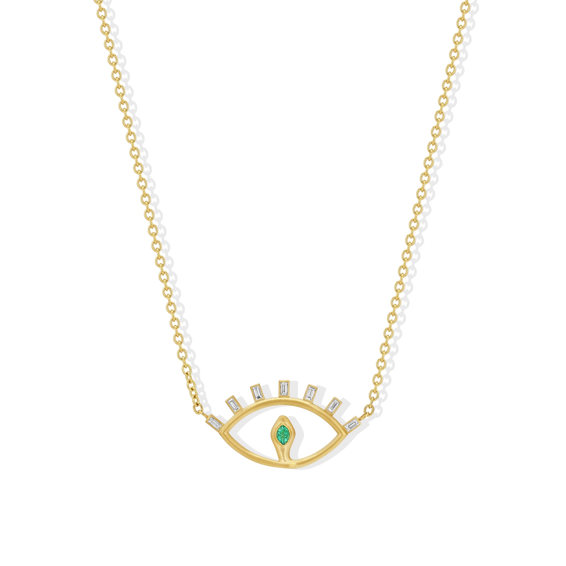 Striking 14k yellow brushed gold evil eye necklace with snake head and diamond eyelashes, in celebration of The Year of the Snake. 7 diamond baguettes @ 0.175 cts. 1 marquise emerald @ 0.06 cts. Cable chain adjustable 18-20 inches. Stack with other items in our brushed gold collection. The evil eye symbolizes protection and snakes signify health, renewal and wisdom. Make this beautiful bracelet your favorite talisman.