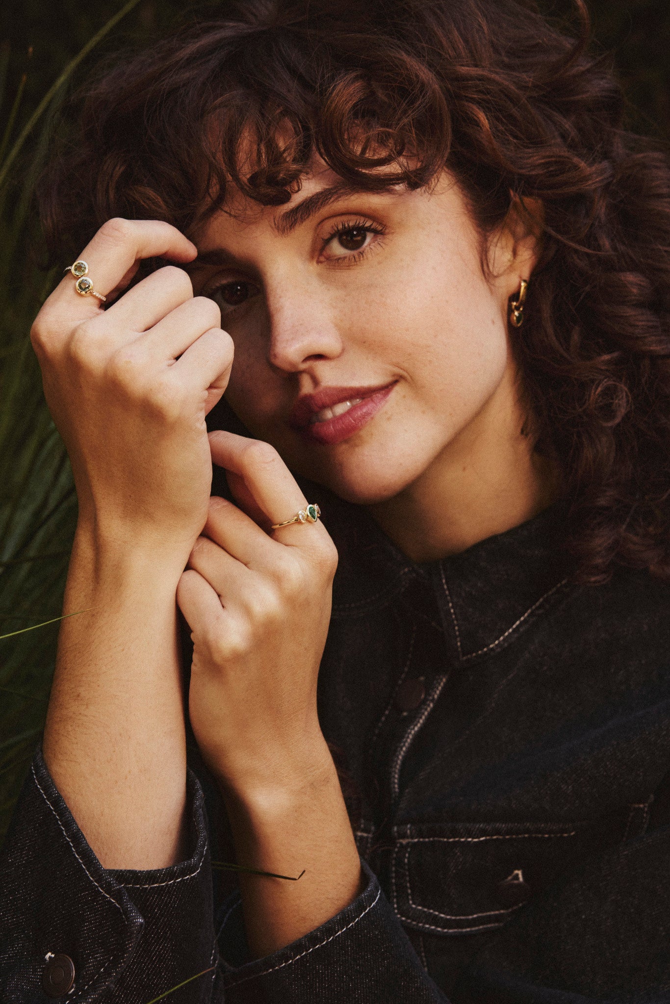 Striking Ring featuring 2 round, green sapphires @ 1.68 ctw and a diamond embellished band @ 0.10 ctw. Size 6.5. Green sapphires are special stones believed to represent the divine energy of nature's life force flowing through all things. They also symbolize wisdom, integrity, and renewal. This moi et toi piece would make a unique engagement ring.