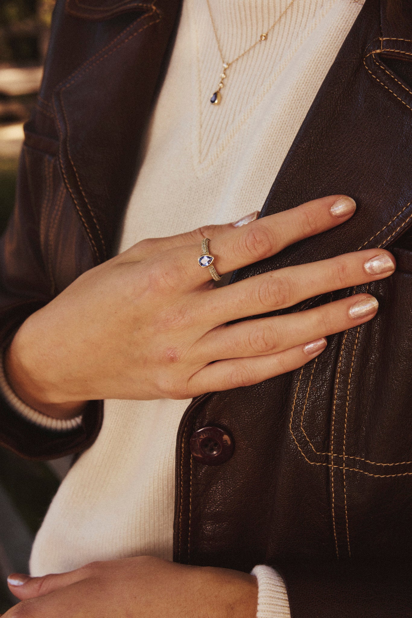 A gorgeous and artful ring, featuring a 7x5mm AA natural, pear-shaped Tanzanite, equalling 0.5 cts, with a halo consisting of 16-1mm round diamonds. The ring's band is embellished with 98 - 1mm AA, faceted Swiss Blue Topaz. Shoulder width 3.19mm and ring band width 3.2mm. Size 7.