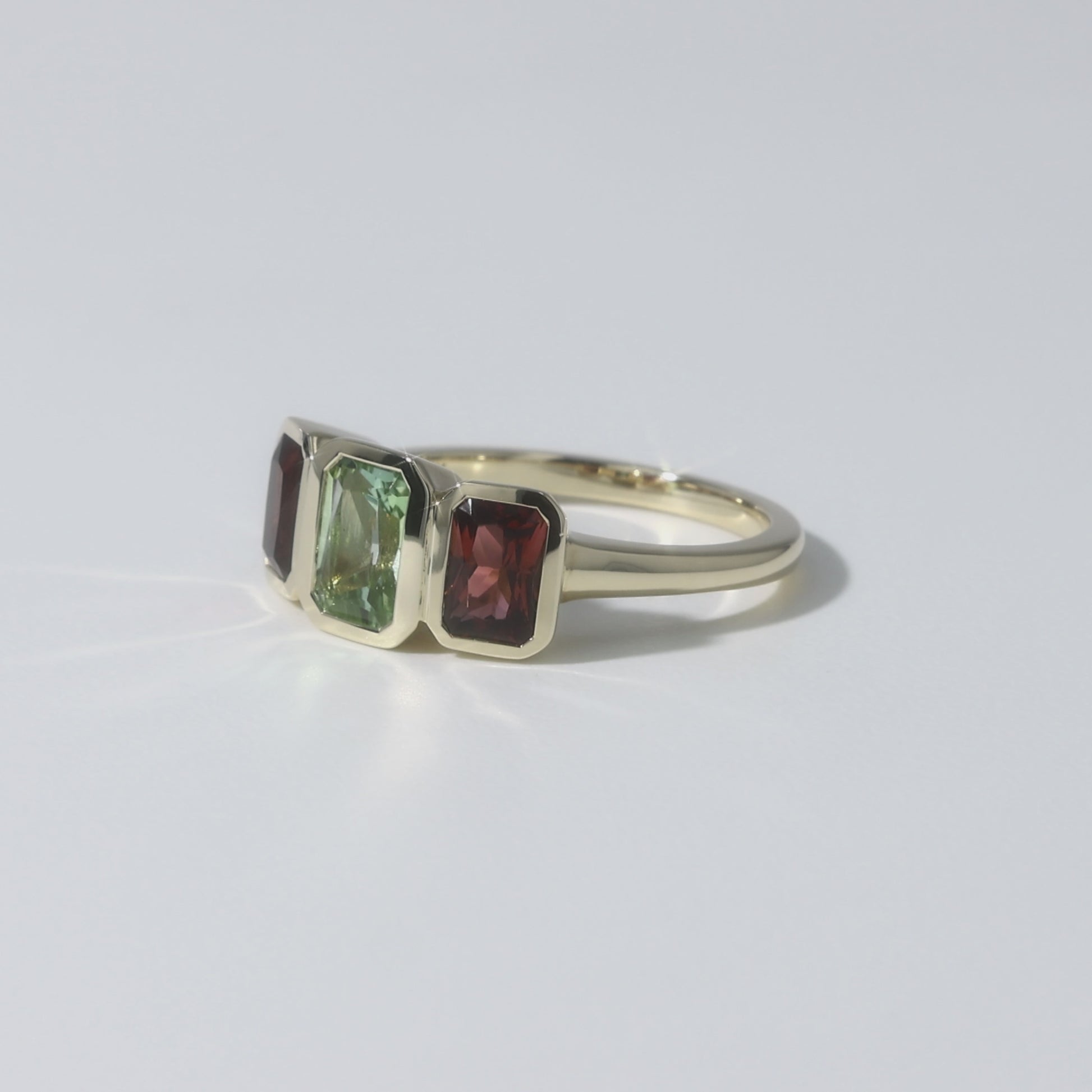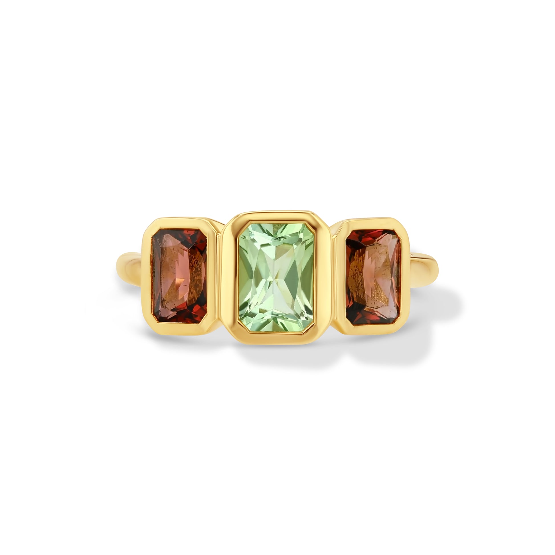 Striking, 14k yellow gold, bezel-set ring with 2 dark pink, 6x4 mm tourmalines and one 7x5 mm mint tourmaline. Stunning with JewelBird's matching Pink and Mint Tourmaline Radiant Earrings, Pink and Mint Tourmaline Earrings, and our Greek Key Toumaline Earrings. Size 7.